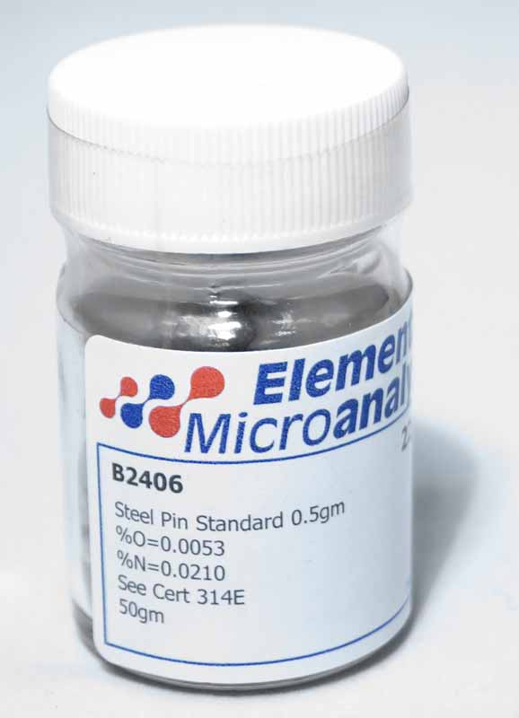 Steel Pin Standard 0.5 g Approximate values 249ppmN 30ppmO 0.0249%N 0.0030%O See certificate 240219. 50 g